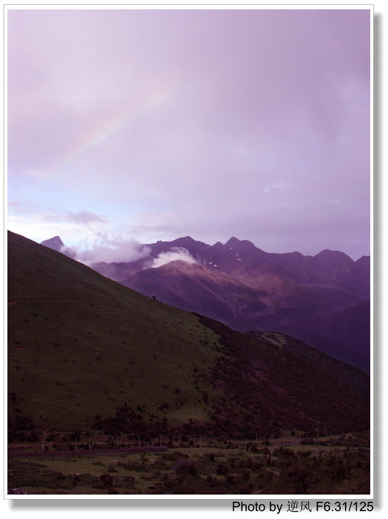 惊魂稍定,大家统一意见,都愿意继续走下去。都说川藏险,今天可算是见识了,这几天什么倒霉的事都遇上了,后面还能再怎么样呢?找了辆车,继续前进。天气阴沉又下起雨来,大伙都不说话,前路漫漫,不知还会有什么事情在等待我们。将近八美,地势逐渐升高,山峦草原次第展开,绿意盎然,大家心情也逐渐好了起来。此番故地重游,我是别有一番滋味在心头。峰回路转,阴霾渐收,一抹淡淡的彩虹斜挂天际,虽然只是依稀可辨,但我仍然呆呆的望着,就觉得心里亮堂堂、身上暖洋洋的,真的是不经历风雨,怎么见彩虹,我知道,好日子终于来了。